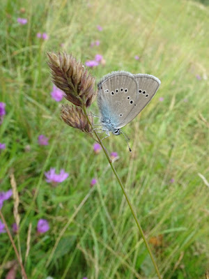 Le soleil n'est pas loin, mais à du mal à percer. On attaque la descente. Ensuite, le GR emprunte des pistes de ski de fond au milieu des pâturages où trônent des gentianes fleuries. Superbe paysage.
